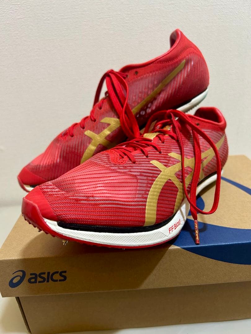 体調不良になり、今シーズンのマラソンがなくなったのでお譲りします。箱無しのためお安く出品します。原則値下げ不可SPEED EDGE TOKYOシューズは、自己記録更新を目指すピッチスタイルのランナーのために設計された、トップアスリート向けのレーシングシューズです。 このシューズを着用したランナーは、ピッチを増やすことでスピードを上げ、一歩一歩のエネルギーを節約することができます。新設計のFF LEAPフォーム・テクノロジーは、アシックスのフォーム材のなかで最も軽量で弾むようなはき心地を提供します。ミッドソールの上層部に配置され、クッション性と優れたエネルギーリターンを提供します。ミッドソールの下層部にはFF TURBO PLUSを採用。この構成は、フォームの反応性を高めると同時に、中足部からかかとの沈み込みを抑制し、より優れた安定性を生み出します。Made inVietnam素材インナーソール素材:合成樹脂(FF LEAP)/固定式本商品に使用している中敷は、初めは浮いている場合がございますが、ご使用を重ねるごとに接着が安定し、 最終的に固定される仕様になっております。あらかじめご了承ください。備考靴底の最大の厚さ:約39.5 mmサイズ22.5-29, 30幅/ラストSTANDARDアッパー素材合成繊維アウター素材ゴム底・合成底| カテゴリー: | スポーツ>>>陸上競技>>>スパイク・シューズ |
