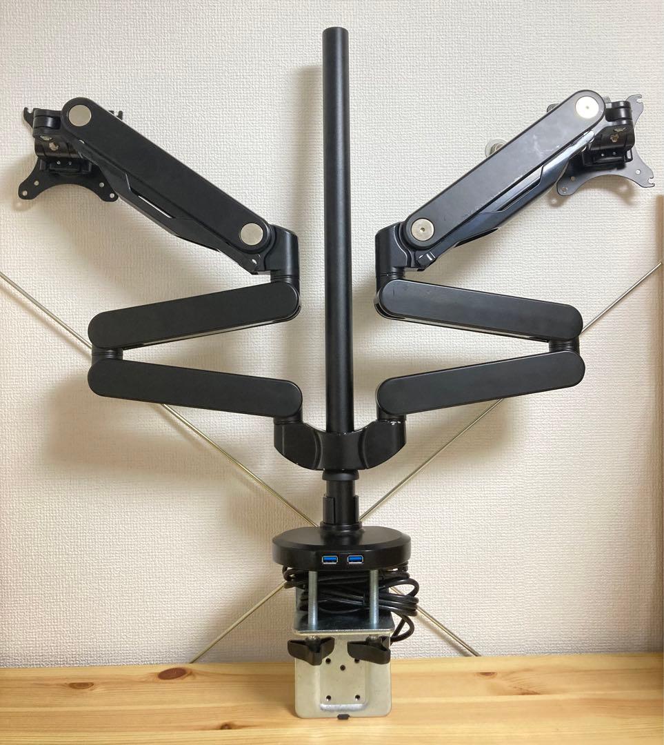 - テレワークでノートPC+モニタの組み合わせで利用していました。 モバイルノートは画面が小さいためもう一つモニタを追加して大きな画面2つで作業をしたかったのですが机のワークスペースが狭くなってしまうため、 スペース確保にモニターアームを探していました。 ほしい機能と価格のバランスがちょうどよかったので決めました。 結果として満足しています。 ただし、細かいところの作りこみにもう少し改善点を感じたので星4つにさせて頂きました。 ・ポールとアームの接合部で締め付けたときの樹脂パーツにもう少し密着感が欲しい。 ・アームへVESA用プレートを差し込む部分の遊びが大きいように感じる。 (モニターを動かす際、遊びが気になりますが他のアームを使ったことがないので比較はできません) ・台座底に張り付けるクッション(ドーナツ型)と両面テープの間にゴミ(細かい複数の樹脂片)が挟まっていたので、その部分のテープを取り除いてから張り付けた。 (そのまま取り付けたら机が傷つきそうでした)